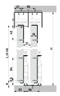 This system features upper guides equipped with two bearings designed for 37 mm rails, including one kind guides at the top and two DPX 80 rollers on the bottom rail. It is compatible with 55-60 mm single-channel bottom rails and incorporates a soft-close mechanism.