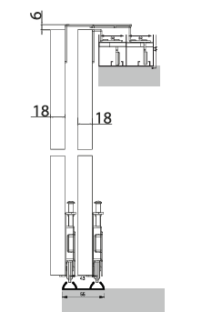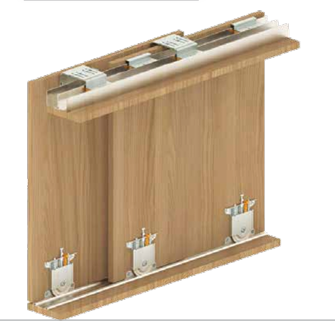 This system features a rail at the top of the wardrobe, with a standard bottom rail measuring 55-60 mm. It includes a soft-close mechanism and can be for use with three doors. There are two types of mechanisms at the top: one for the inner door and another for the outer door.