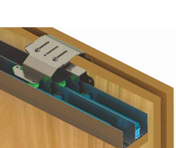 This system features a rail at the top of the wardrobe, with a standard bottom rail measuring 55-60 mm. It includes a soft-close mechanism and can be for use with three doors. There are two types of mechanisms at the top: one for the inner door and another for the outer door.