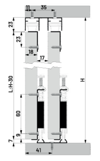 This system includes adjustable upper guides, featuring an economical left and right guide at the top, as well as two DPX 80 rollers on the bottom rail. It is compatible with 55-60mm single-channel bottom rails and includes a plastic stopper.