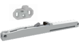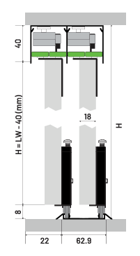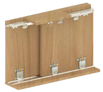 This system features l upper guides with two bearings , and two DPX 80 rollers on the bottom rail. It is compatible with 55-60mm rails and incorporates a soft-close mechanism.